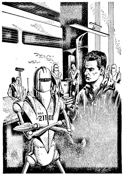 His voice was breathless, as if he'd been running hard. "What's the matter now?" Why, I wondered, couldn't the plant get along one morning without me? Seven o'clock—what a time to get up. Especially when I hadn't been to bed until four. "We got grief," Jack moaned. "None of the robots showed up, that's what! Three hundred androids on special assembly this week—and not one of them here!" By then I was awake, all right. With a government contract due on Saturday we needed a full shift. The Army wouldn't wait for its uranium; it wouldn't take excuses. But if something had happened to the androids.... "Have you called Control yet?" "Yeah. But they don't know what's happened. They don't know where the androids are. Nobody does. Three hundred Grade A, lead-shielded pile workers—missing!" "I'll be right down." I hung up on Jack and looked around for my clothes. Funny, they weren't laid out on the bed as usual. It wasn't a bit like Rob O to be careless, either. He had always been an ideal valet, the best household model I'd ever owned. "Rob!" I called, but he didn't answer. By rummaging through the closet I found a clean shirt and a pair of pants. I had to give up on the socks; apparently they were tucked away in the back of some drawer. As for where Rob kept the rest of my clothes, I'd never bothered to ask. He had his own housekeeping system and had always worked very well without human interference. That's the best thing about these new household robots, I thought. They're efficient, hard-working, trustworthy— Trustworthy? Rob O was certainly not on duty. I pulled a shoe on over my bare foot and scowled. Rob was gone. And the androids at the factory were gone too.... My head was pounding, so I took the time out to brew a pot of coffee while I finished dressing—at least the coffee can was in plain view in the kitchen. The brew was black and hot and I suppose not very well made, but after two cups I felt better. The throb in my head settled down into a dull ache, and I felt a little more capable of thinking. Though I didn't have any bright ideas on what had happened—not yet. My breakfast drunk, I went up on the roof and opened the garage doors. The Copter was waiting for me, sleek and new; the latest model. I climbed in and took off, heading west toward the factory, ten minutes flight-time away.